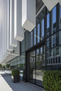 Od strony zewnętrznej (al.Szucha i ul.Litewska) zastosowano rytmiczne pionowe nadwieszone elementy elewacyjne z prefabrykatów betonowych (biały beton architektoniczny) oraz od strony ogrodu i na elewacjach wewnętrznych zastosowano elementy elewacyjne szklane (szklane żyletki oraz rośliny).